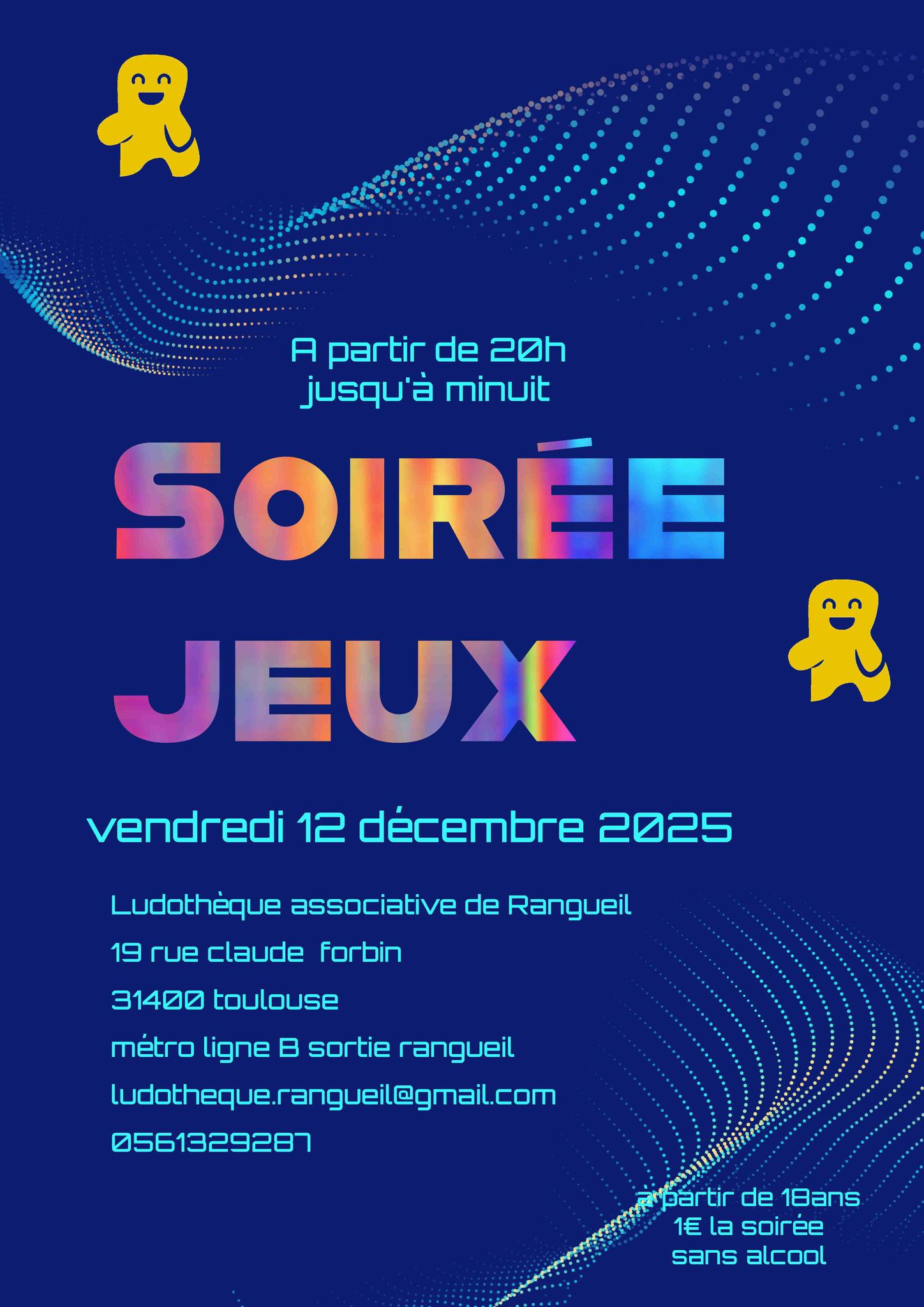 [Ludo Rangueil] Soirée jeux Date(s) et lieu de l'évenement 12 décembre 2025 Laissez un commentaire Ludothèque de RangueilDétails de l'évenement Type de l'évenementSoirée jeu : soirée de jeux organisé généralement par une association.Organisateur(s) de l'évenementLudothèque de Rangueil (ludothèque autour de Toulouse)